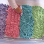 Make at least 4 colors. Use your kitchen measuring cups and don’t guesstimate, else your cloud dough recipe will be too wet.Â